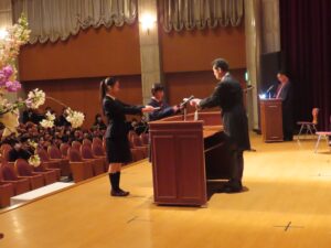 礼拝 学校長式辞 理事長祝辞 記念品授与 の様子です。