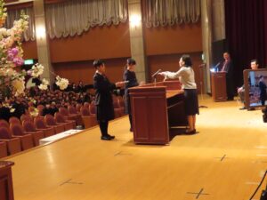 続いて、保護者会よりの記念品授与 新入生歓迎の言葉 新入生誓いの言葉 礼拝(恩徳讃) 担任等紹介