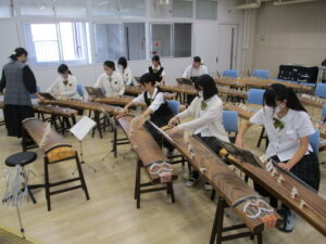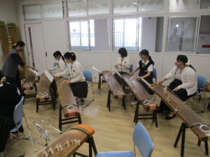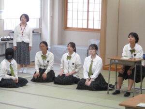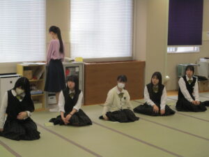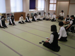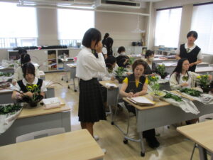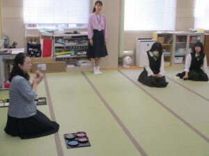 華道・筝曲・礼法の様子から紹介します。生徒が立っているのは、出来上がった作品を評価してもらっている場面です。