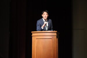 講堂で行った全体会の様子から紹介します。