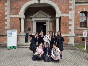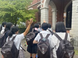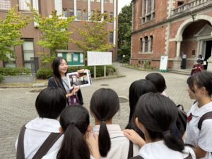 その後3つのグループに分かれてのキャンパスツアーを実施しました。グループ毎にガイド役の大学生に帯同いただき,重要文化財に指定されている建物を中心に歴史的価値の高い建造物の由来やそのエピソード話,また自身のキャンパスライフなども交えて説明していただきました。