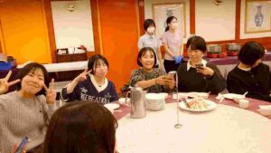 夕食の時間、生徒たちは和やかな雰囲気で食事を楽しんでいました。異文化に触れながら、クラスの交流も深まっています。